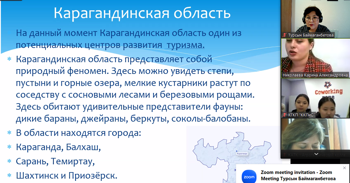 31 октября 2024 года в рамках реализации программы «Біртұтас тәрбие» (проект «Қамқор») прошел областной дистанционный конкурс проектов «Лучший туристский маршрут Карагандинской области» среди студентов организаций технического и профессионального, послесреднего образования. Конкурс организован КГКП «Учебно-методический центр развития образования Карагандинской области» на базе ЧУ «Колледж экономики, бизнеса и права КарУ Казпотребсоюза».