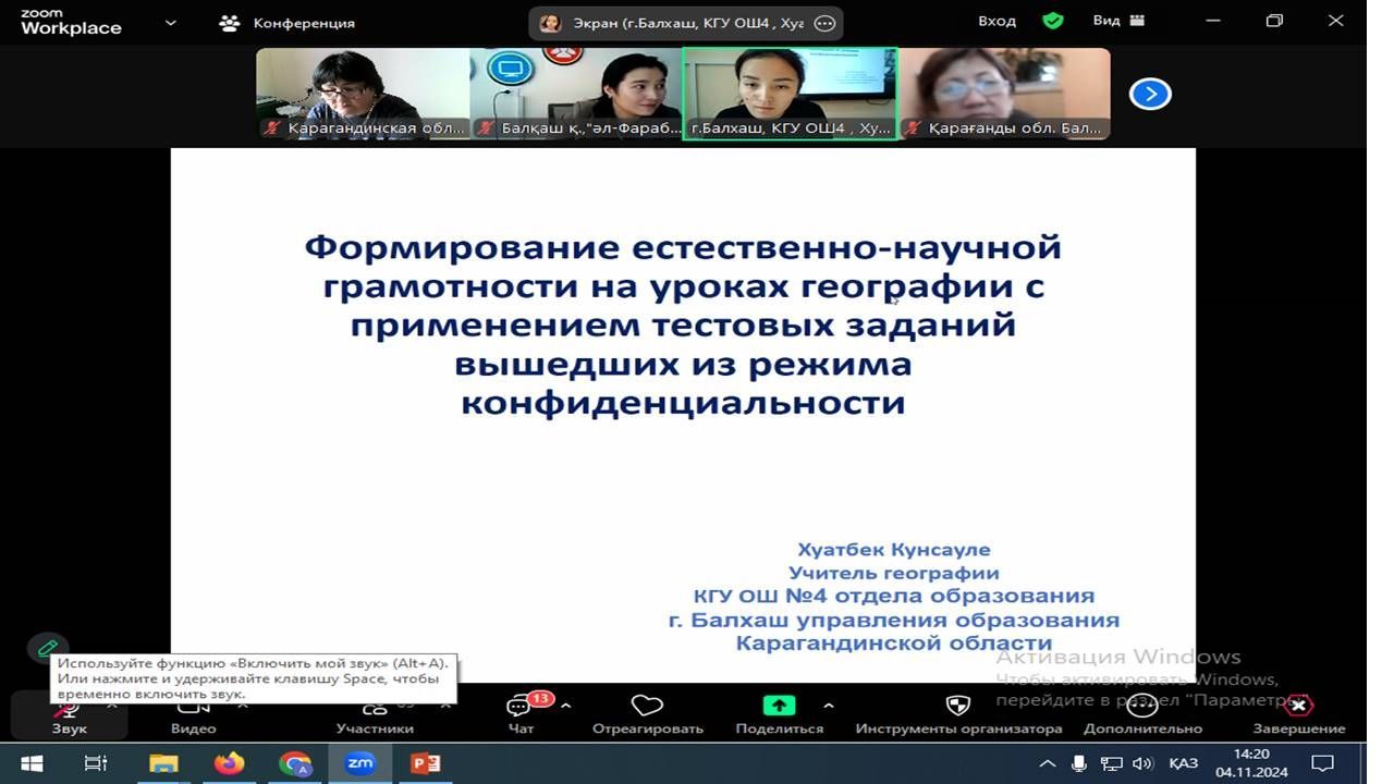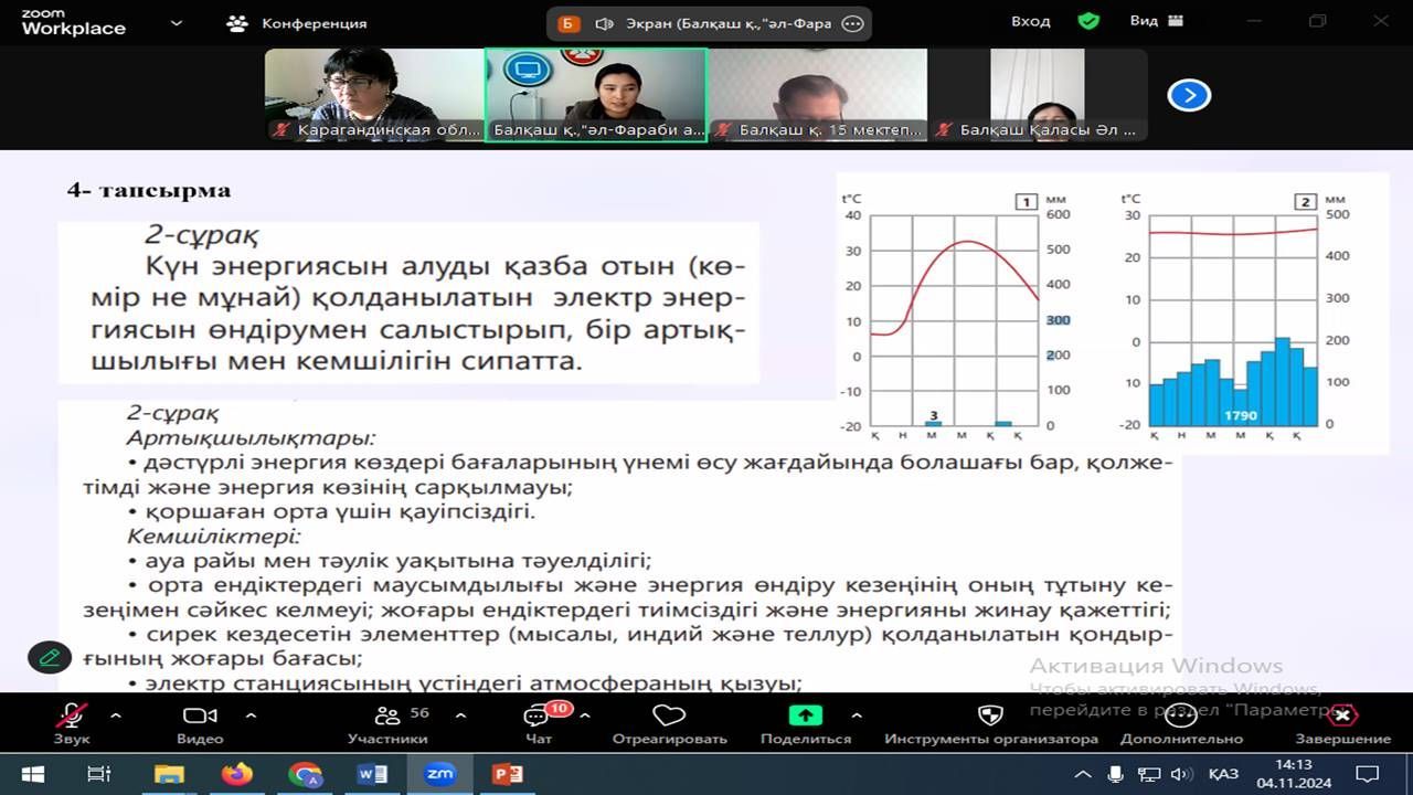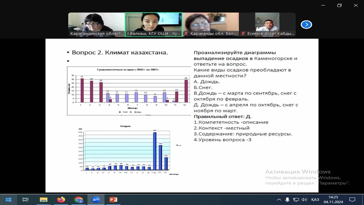 Хуатбек Кунсауле Куатовна, учитель географии, КГУ «Общеобразовательная школа №4» города Балхаш, продемонстрировали эффективные формы работы с обучающимися, направленные на естественнонаучную грамотность. Педагоги показали пути решения заданий вышедших из режима конфиденциальности.