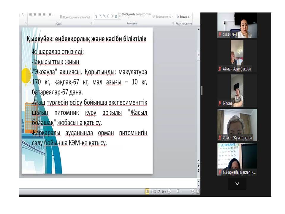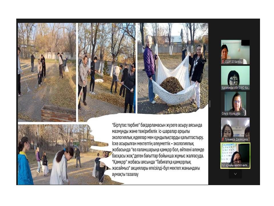 Координатор ресурсного центра по экологическому образования специальных организации образования Усольцева Ольга Владимировна, ознакомив с мероприятиями за I четверти, уделила особое внимание особенностям использования методов и видов экологической деятельности в рамках республиканских социальных проектов программы воспитания «Біртұтас тәрбие».