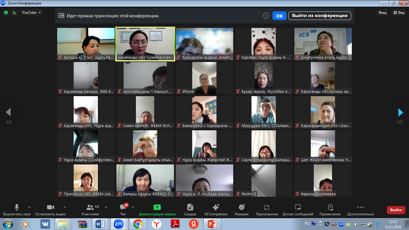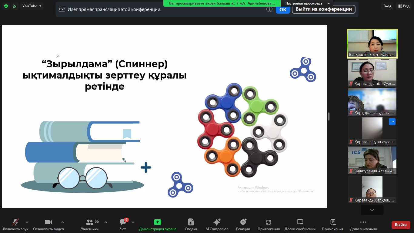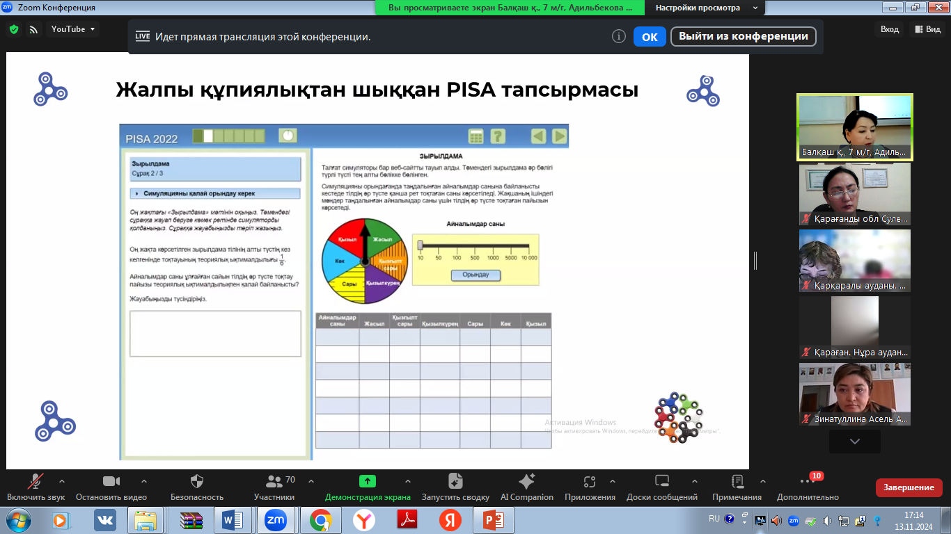 2024 жылдың 11, 13 қараша күндері Қарағанды облысында білім беруді дамытудың оқу-әдістемелік орталығының ұйымдастыруымен математикалық сауаттылықты арттыру мақсатында практикалық семинар өткізілді. Семинар барысында «Зырылдама» тапсырмасының шешу жолдары талқыланды.