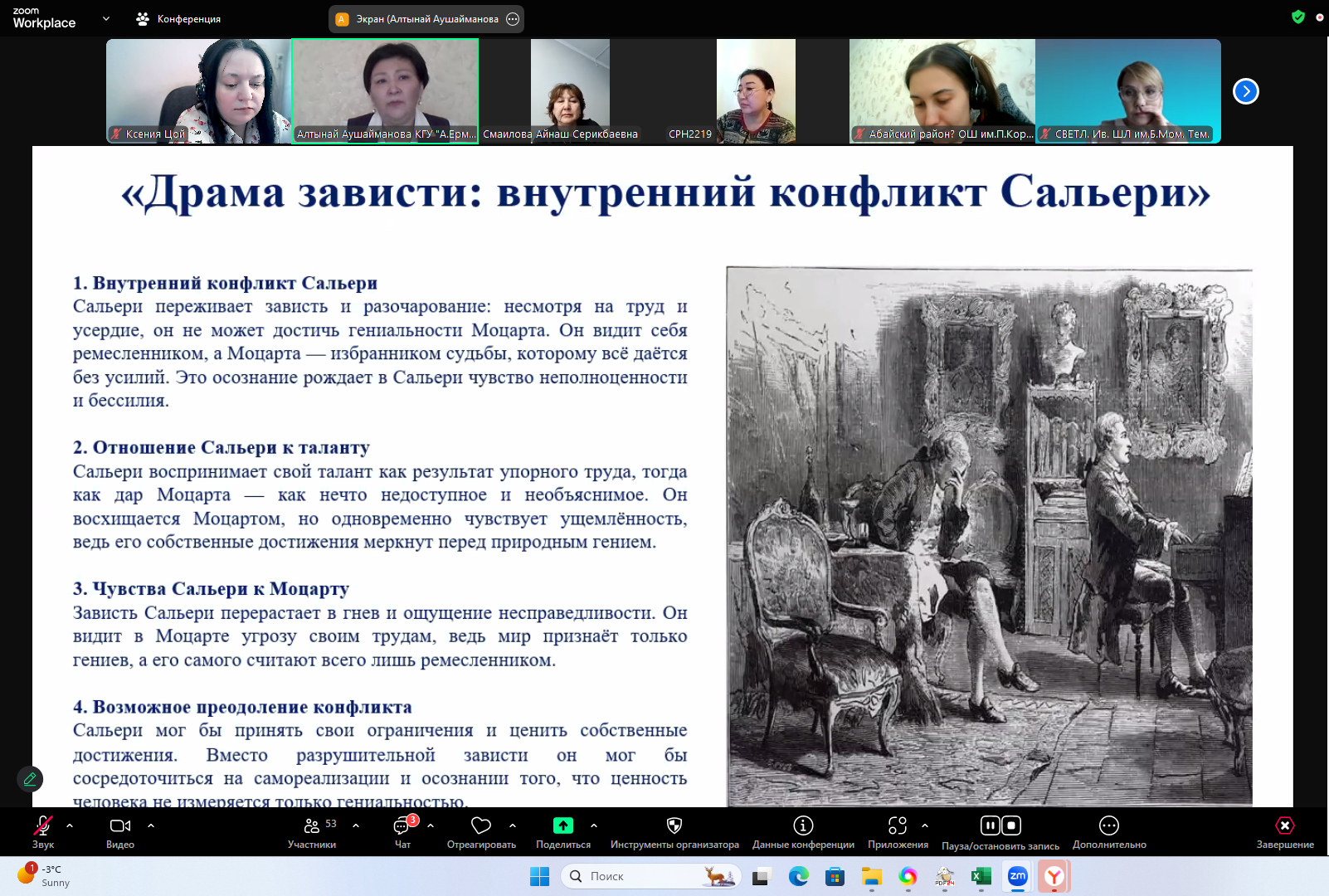 Қарағанды облысында білім беруді дамытудың оқу-әдістемелік орталығы 2025 жылғы 20 ақпанда орыс тілі мен әдебиеті мұғалімдеріне «Орыс тілі мен әдебиеті сабақтарында оқу сауаттылығын дамыту» семинарын өткізді. Семинардың модераторы ҚО ББД ОӘО әдіскері Цой Ксения Петровна болды. Қарағанды қаласының «Ә.Ермеков атындағы мектеп-лицейі» КММ орыс тілі мен әдебиеті пәнінің мұғалімі Алтынай Нургалиевна Аушайманова педагогтермен бірге А.С.Пушкиннің «Моцарт және Сальери» шығармасы бойынша оқу сауаттылығын дамытуға бағытталған оқулық тапсырмаларын пысықтады. Педагогтер семинарға белсенді қатысып, өздерімен және айналасындағылармен қарым-қатынастың әртүрлі тәсілдерін талдау, қоршаған ортаның өзін-өзі бағалауға әсері (кейс-талдау), Сальеридің ішкі қақтығысы, ПОПС формуласын қолдана отырып, «Гений и злодейство» тақырыбын талдады. Семинар жұмысына орыс тілі мен әдебиетінің 70 педагогі қатысты.