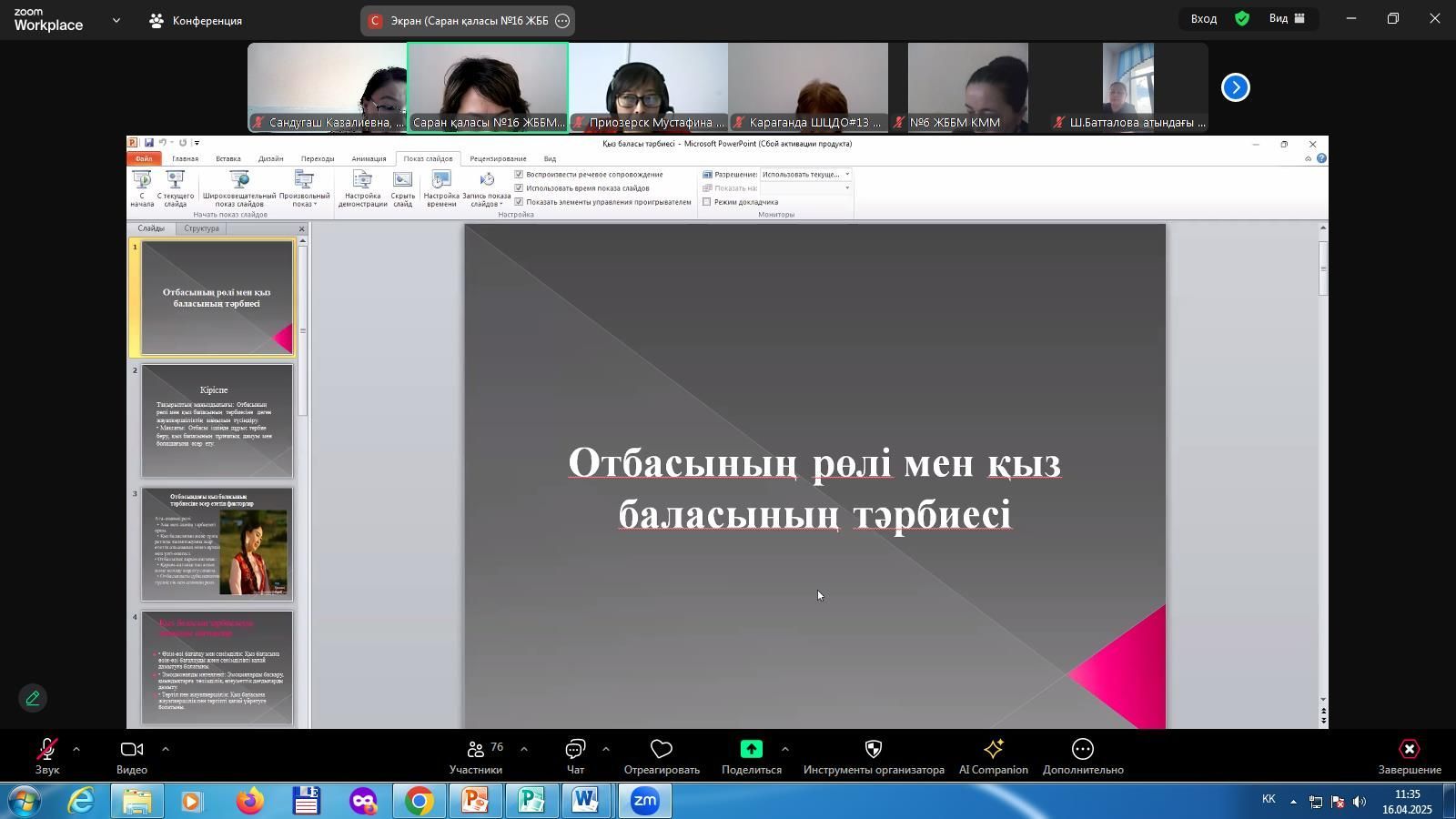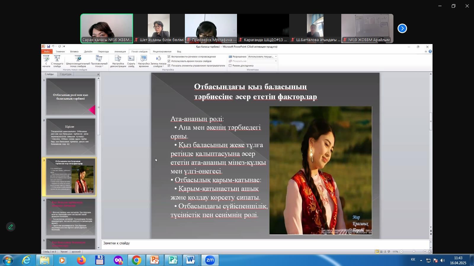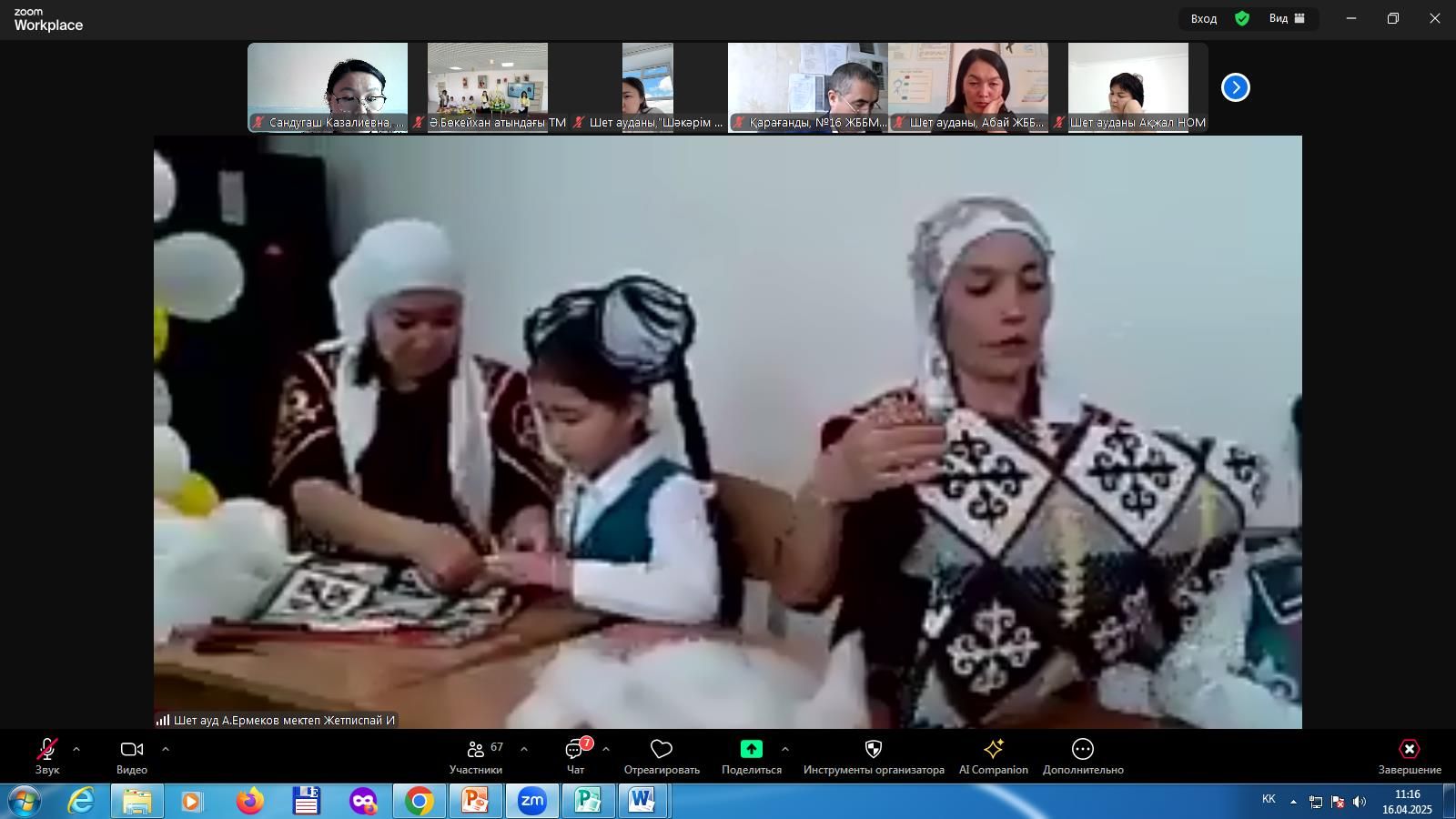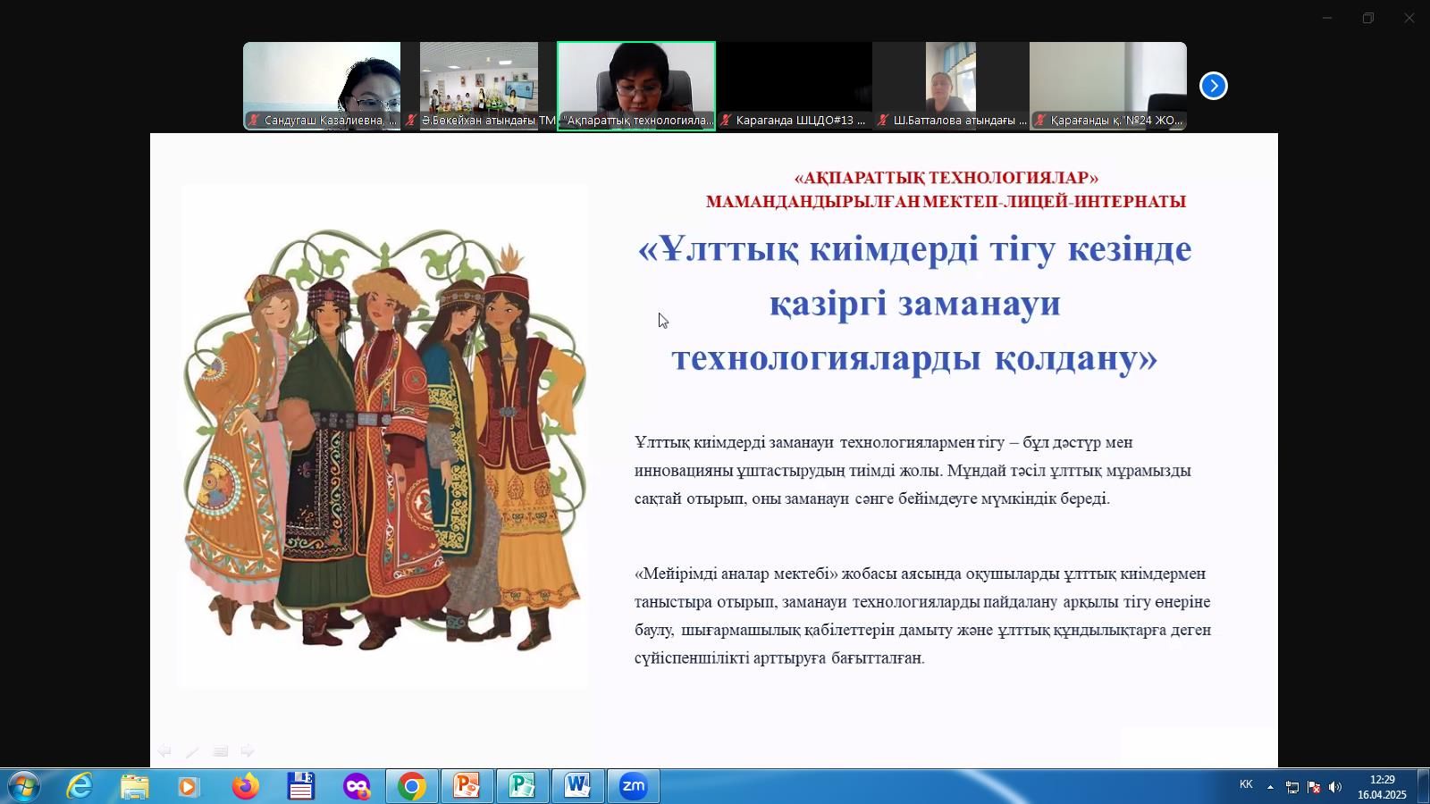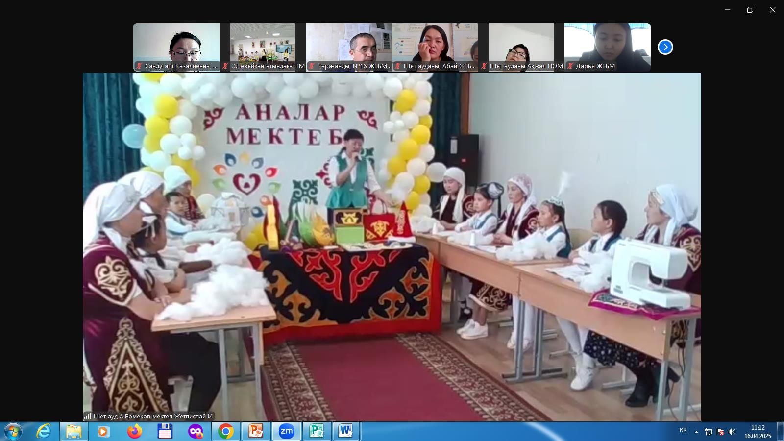 2025 жылдың 16 сәуірінде Қарағанды облысында білім беруді дамытудың оқу-әдістемелік орталығы, Қарағанды облысының тәрбие ісі орынбасары мен «Даналық мектебі» жобасына жауапты жетекшілеріне «Мейірім» аналар клубының «Атадан - өсиет, анадан – қасиет» атты шеберлік сағатын өткізді.