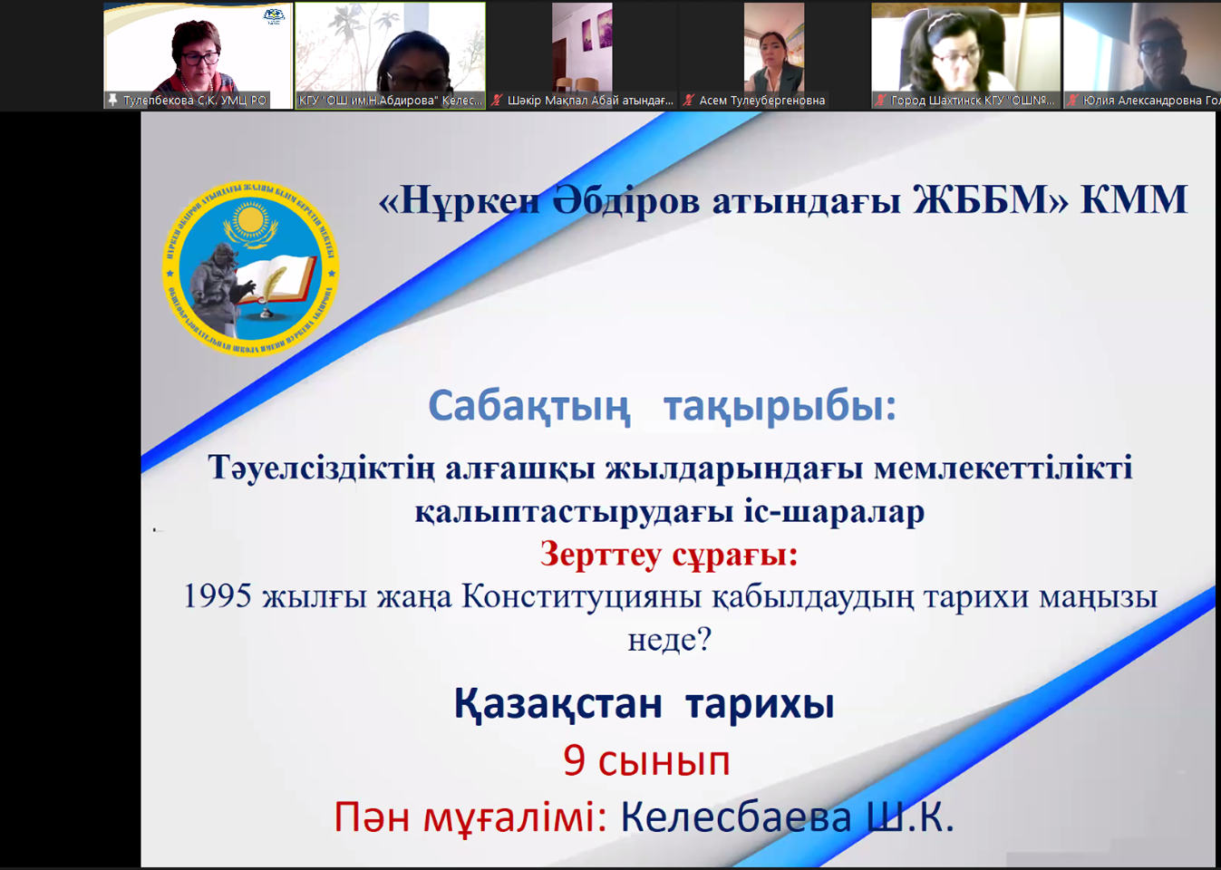 Келесбаева Шарбат Култайовна, КГУ»Общеобразовательная школа имени Нуркена Абдирова, Мекеева Жанара Сериковна, КГУ «Общеобразовательная школа №87», Голяндина Юлия Александровна, КГУ «Основная средняя школа №11» продемонстрировали эффективные формы работы с обучающимися, направленные на разбор заданий западающих тем по истории Казахстана за 9 класс.