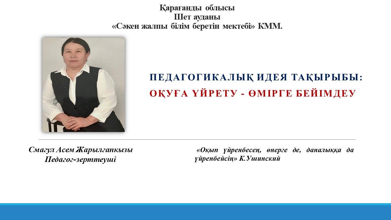 Диплом 1 степени– Смагул Асем Жарылгапкызы, учитель казахского языка и литературы КГУ «ОШ им. Сакена» Шетского района