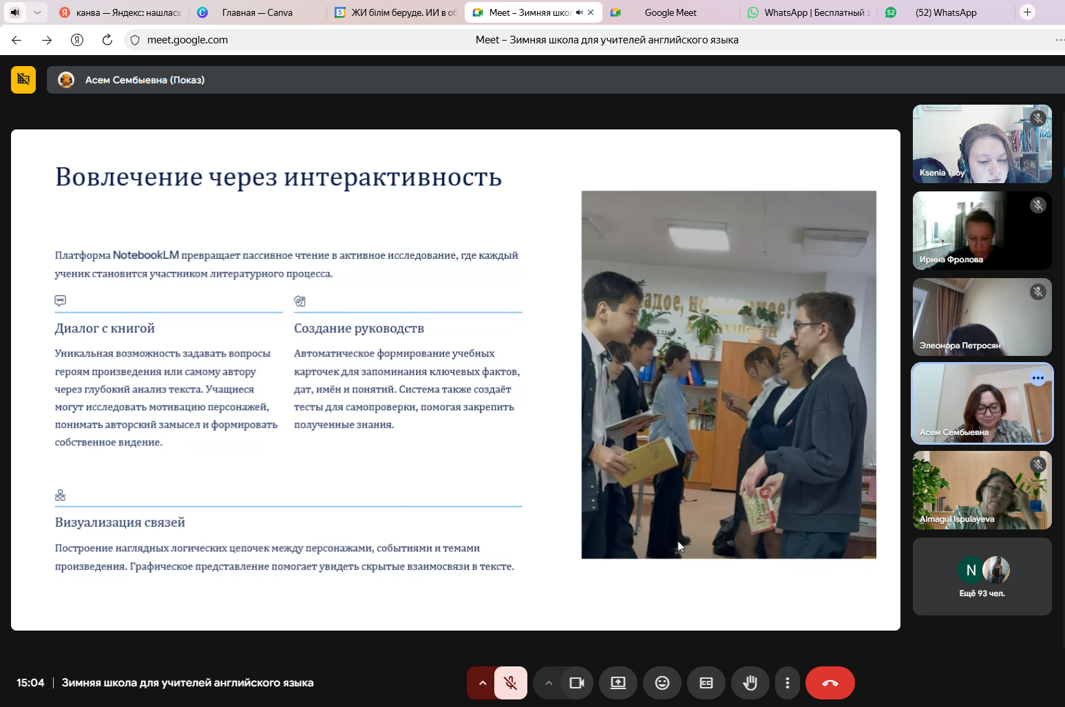 Опыт интеграции цифровых технологий и ИИ в образовательную среду на примере создания визуальной интерактивной новеллы представила Булкина Ангелина Евгеньевна, учитель русского языка и литературы КГУ «ОШ №8» г. Шахтинск, акцентировав внимание на развитии креативного и критического мышления обучающихся.
