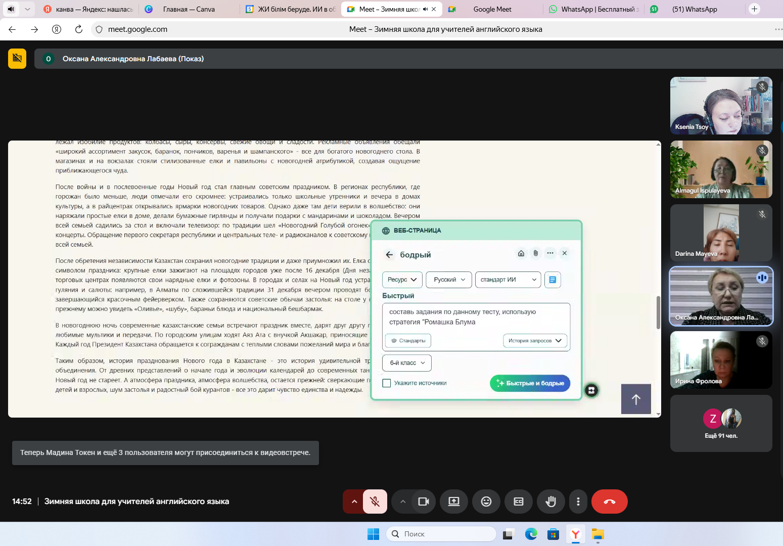 Вопросы интеграции ИИ-сгенерированных мультимедийных материалов в процесс обучения языкам и духовно-нравственного развития обучающихся осветила Казангапова Меруерт Онергалиевна, учитель английского языка КГУ «СШЛИ «Мурагер».