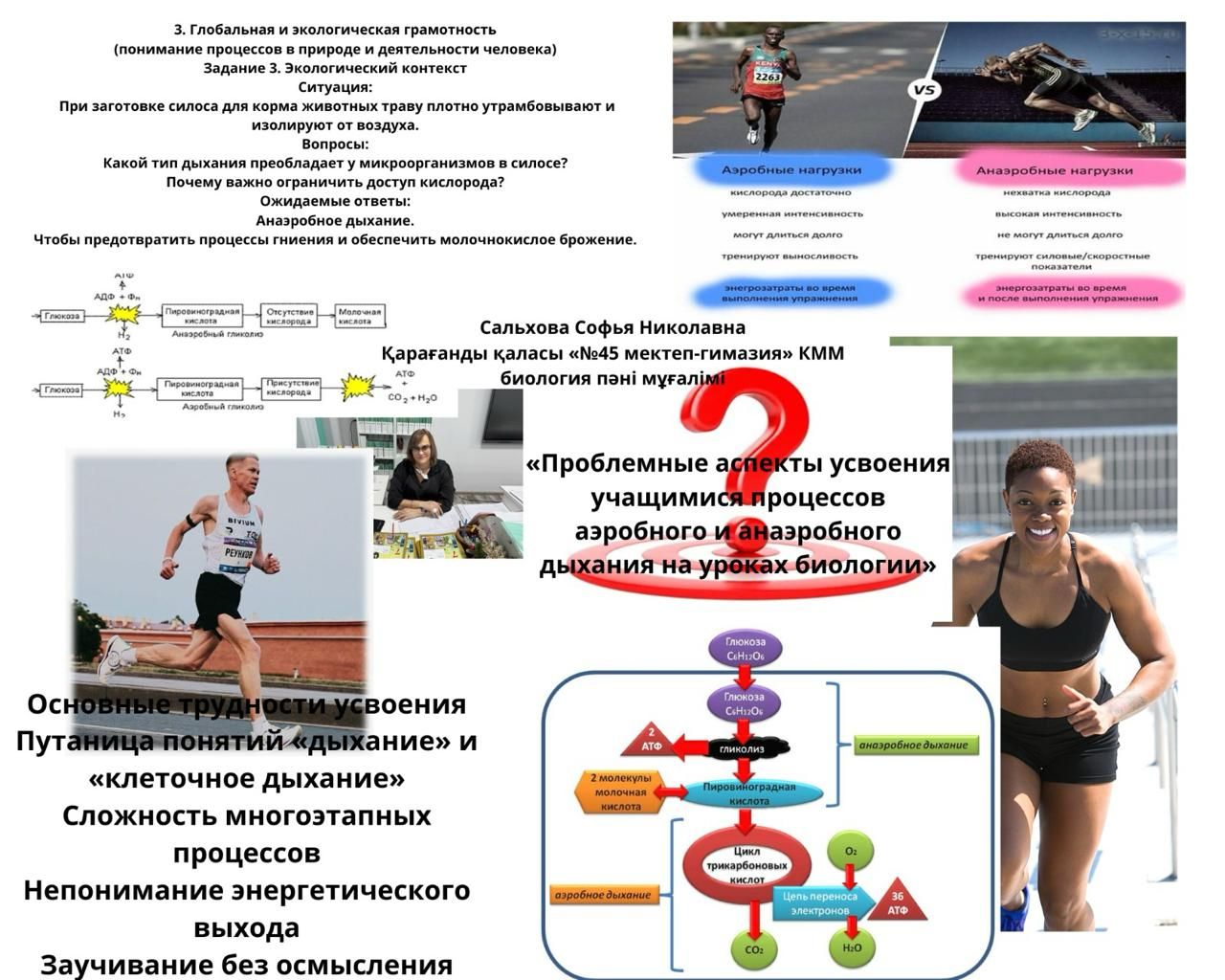 3. Сальхова Софья Николаевна, учитель биологии, г. Караганда, КГУ «Школа-гимназия №45», выступила с темой «Проблемные аспекты усвоения учащимися процессов аэробного и анаэробного дыхания на уроках биологии».