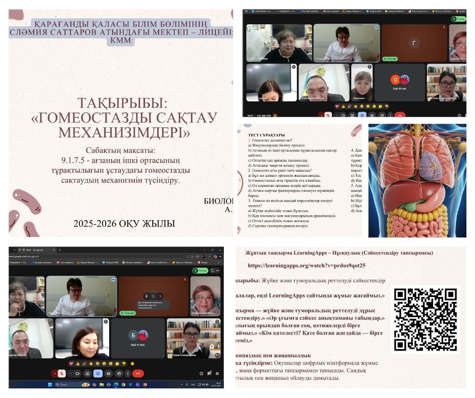 1. Скендирова Актокаш Бейсенбаевна, учитель биологии, г. Караганда, КГУ «Школа-лицей имени С. Саттарова», выступила с темой «Механизмы поддержания гомеостаза».