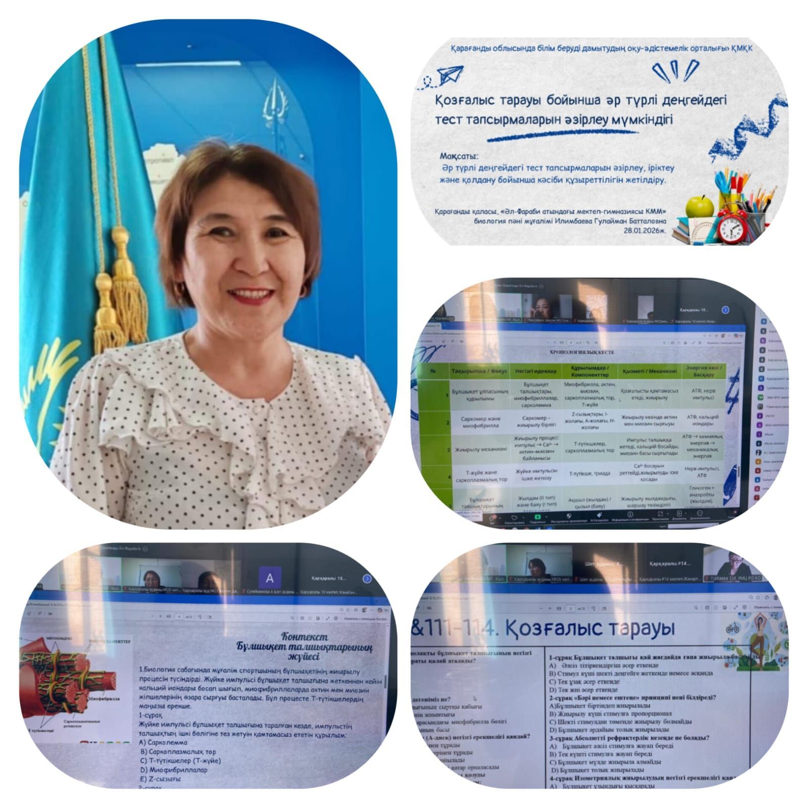 В соответствии с планом Учебно-методического центра развития образования Карагандинской области 28 января 2026 года проведен мастер-класс на тему «Опыт разработки и применения эффективных тестовых заданий на уроках биологии».Цель мастер-класса:продемонстрировать способы разработки эффективных тестовых заданий по биологии, соответствующих учебным целям и различным уровням сложности, а также пути их рационального применения в учебном процессе.