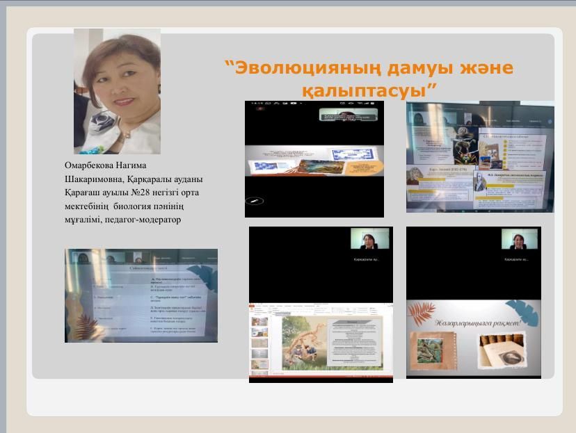 В ходе мастер-класса педагоги Карагандинской области поделились своим практическим опытом:Омарбекова Нагима Шакаримовна, учитель биологии КГУ «ОСШ№28» Каркаралинского района, представила опыт работы по теме «Формирование и развитие эволюционных понятий».Илимбаева Гулайман Батталовна, учитель биологии КГУ «Школа-гимназия имени Аль-Фараби» города Караганды, выступила по теме «Возможности разработки тестовых заданий различного уровня по разделу «Движение».