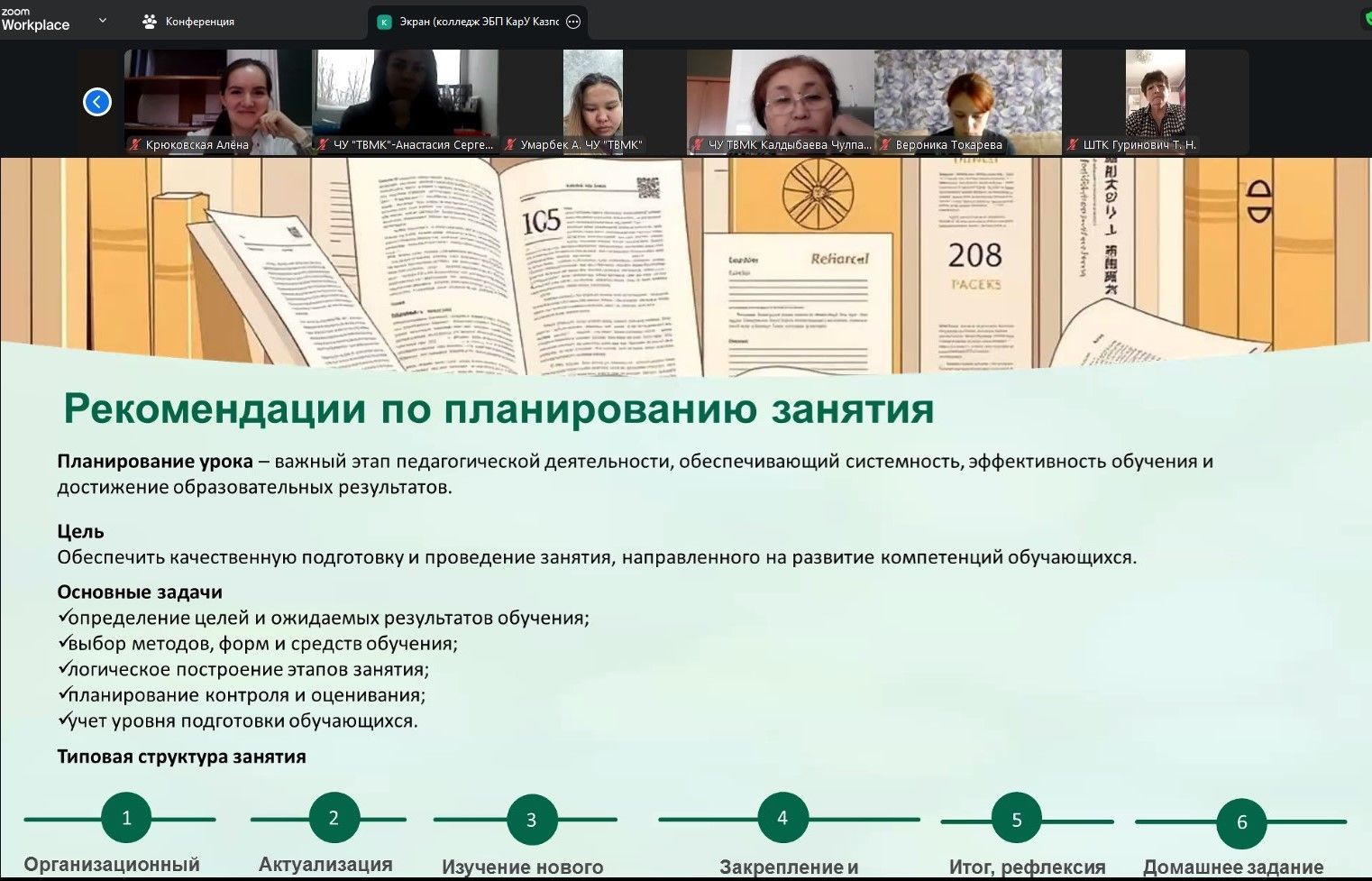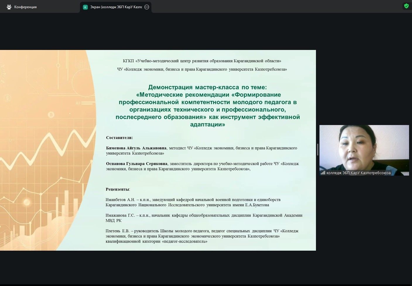 • Методическое сопровождение молодых специалистов:заместитель директора по учебно-методической работе Колледжа экономики, бизнеса и права Оспанова Г.С. и методист Бименова А.А. представили алгоритмы формирования профессиональной компетентности начинающих педагогов через внедрение эффективных адаптационных практик;