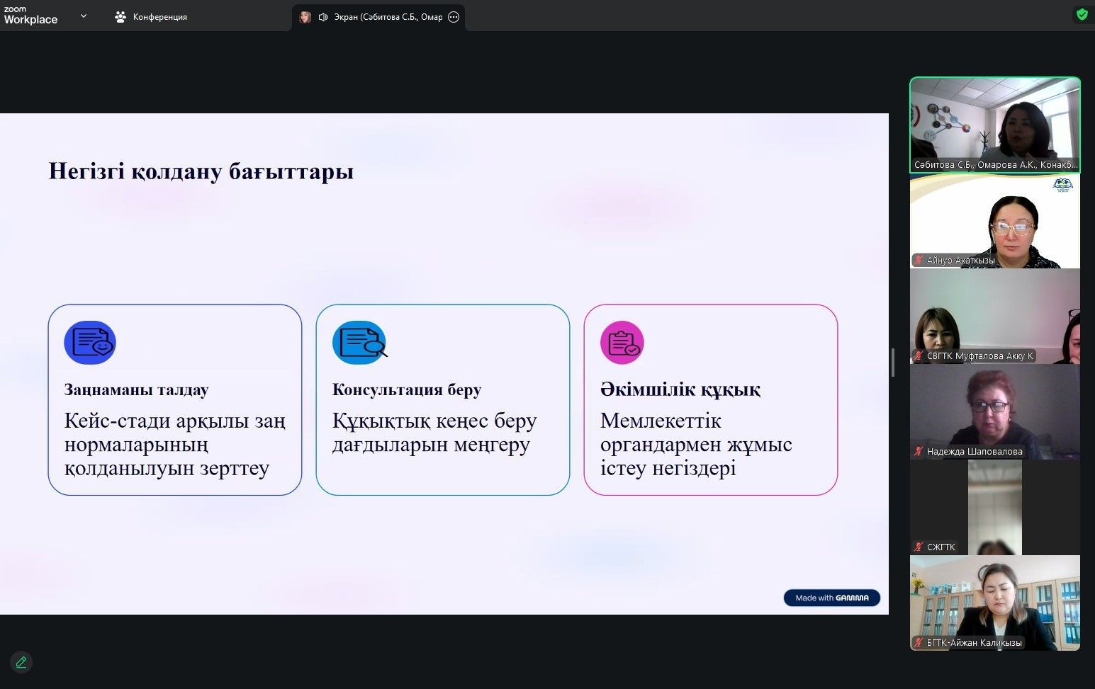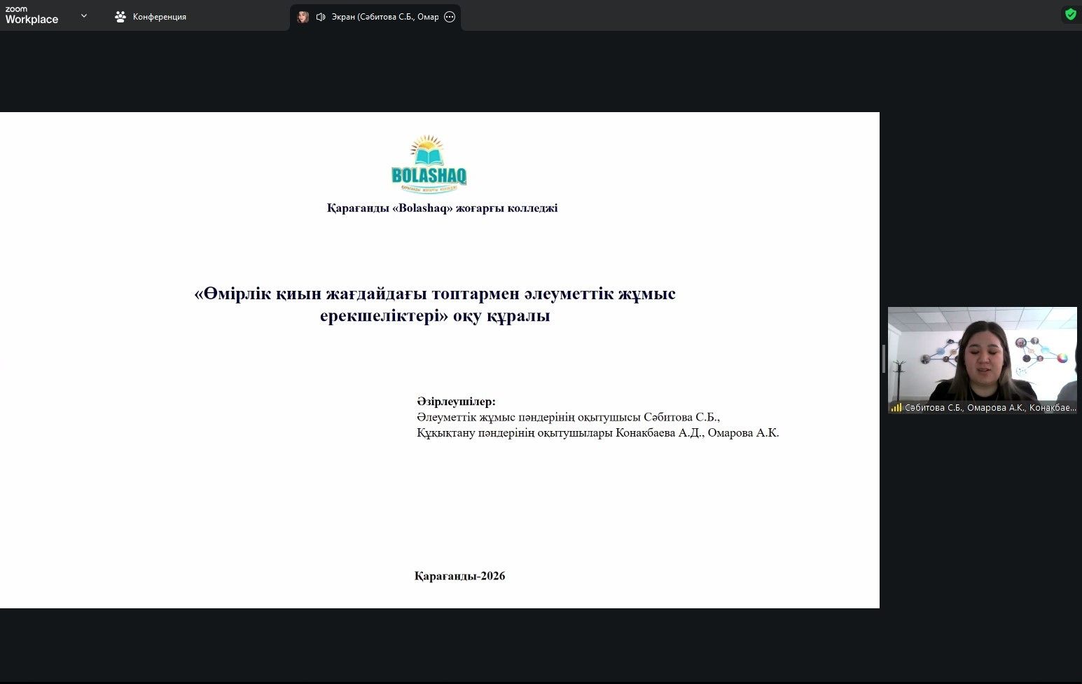 • Практико-ориентированное обучение в социальной сфере:преподаватели Карагандинского высшего колледжа «Bolashaq» Сәбитова С.Б., Омарова А.К. и Конакбаева А.Д. презентовали возможности применения кейс-технологий на основе специализированного учебного пособия по социальной работе с лицами в трудных жизненных ситуациях.