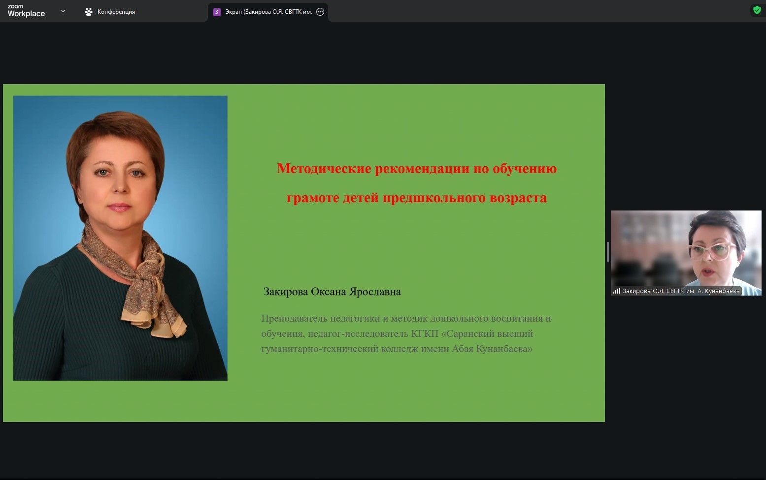 • Инновации в дошкольном воспитании:преподаватель Саранского высшего гуманитарно-технического колледжа им. Абая Кунанбаева Закирова О.Я. продемонстрировала методику использования игровых технологий при обучении грамоте детей предшкольного возраста для обеспечения преемственности с начальной школой;