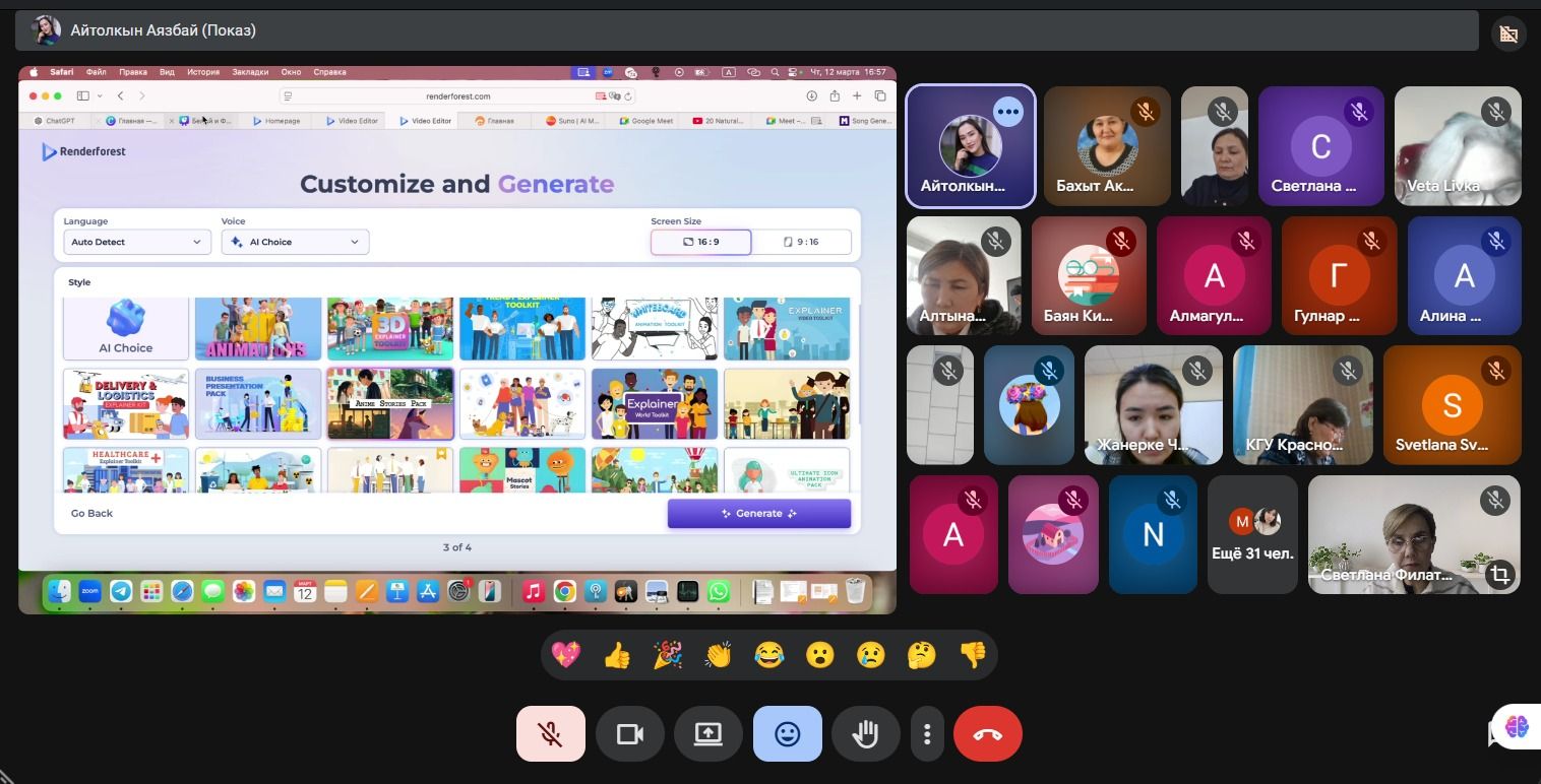 Аязбай Айтолқын Сөртібайқызы, учитель английского языка КГУ «ОСШИКОР им. А.Молдагуловой» Карагандинской области, представила функциональные возможности актуальных инструментов «Magic School», «Suno AI», «Renderforest» и «Curipod».