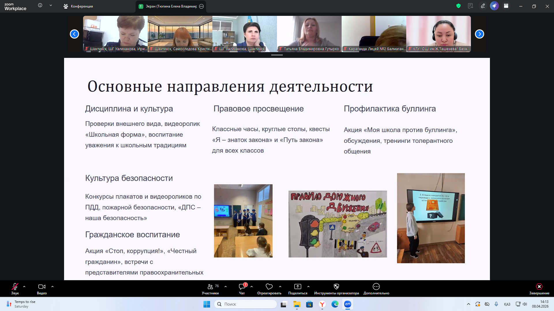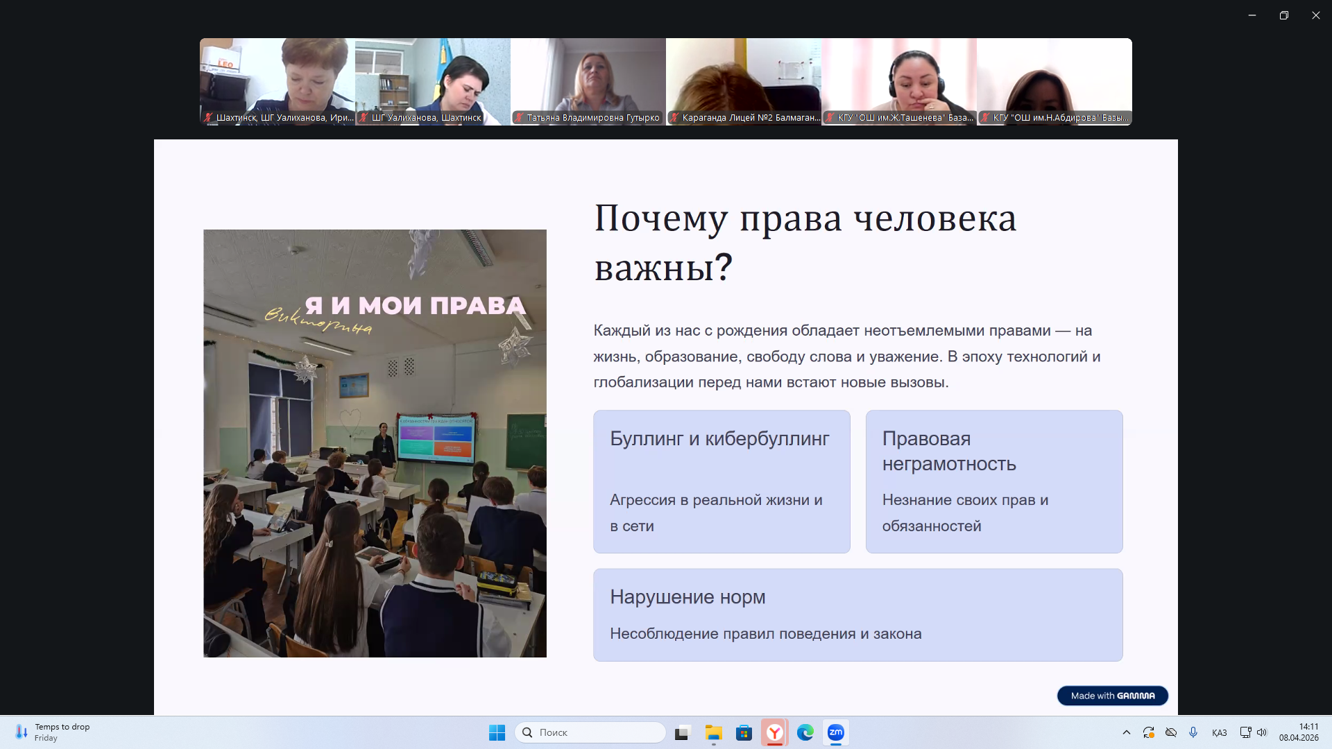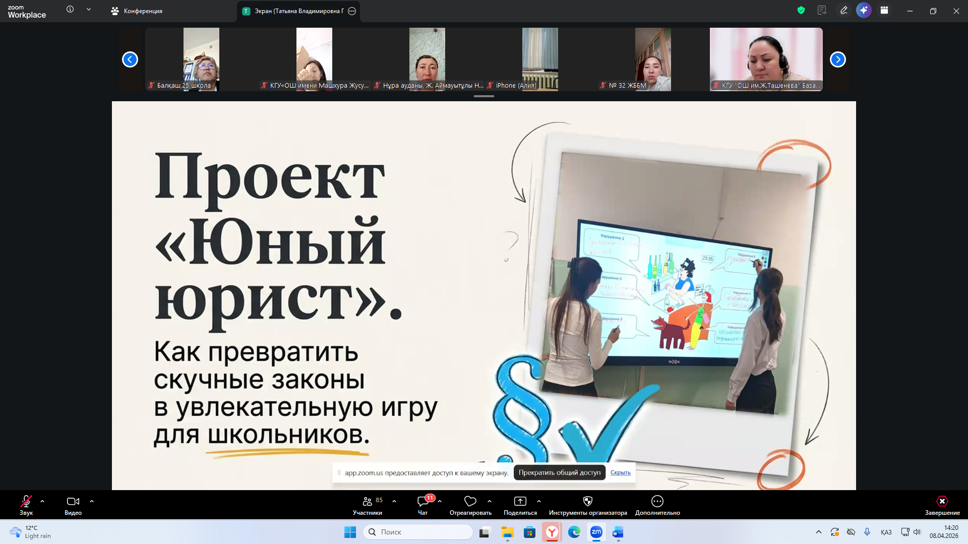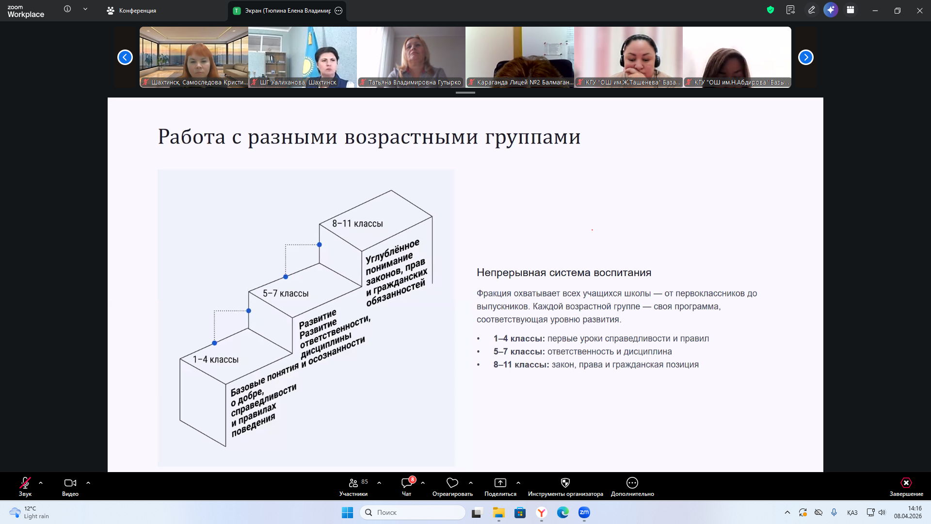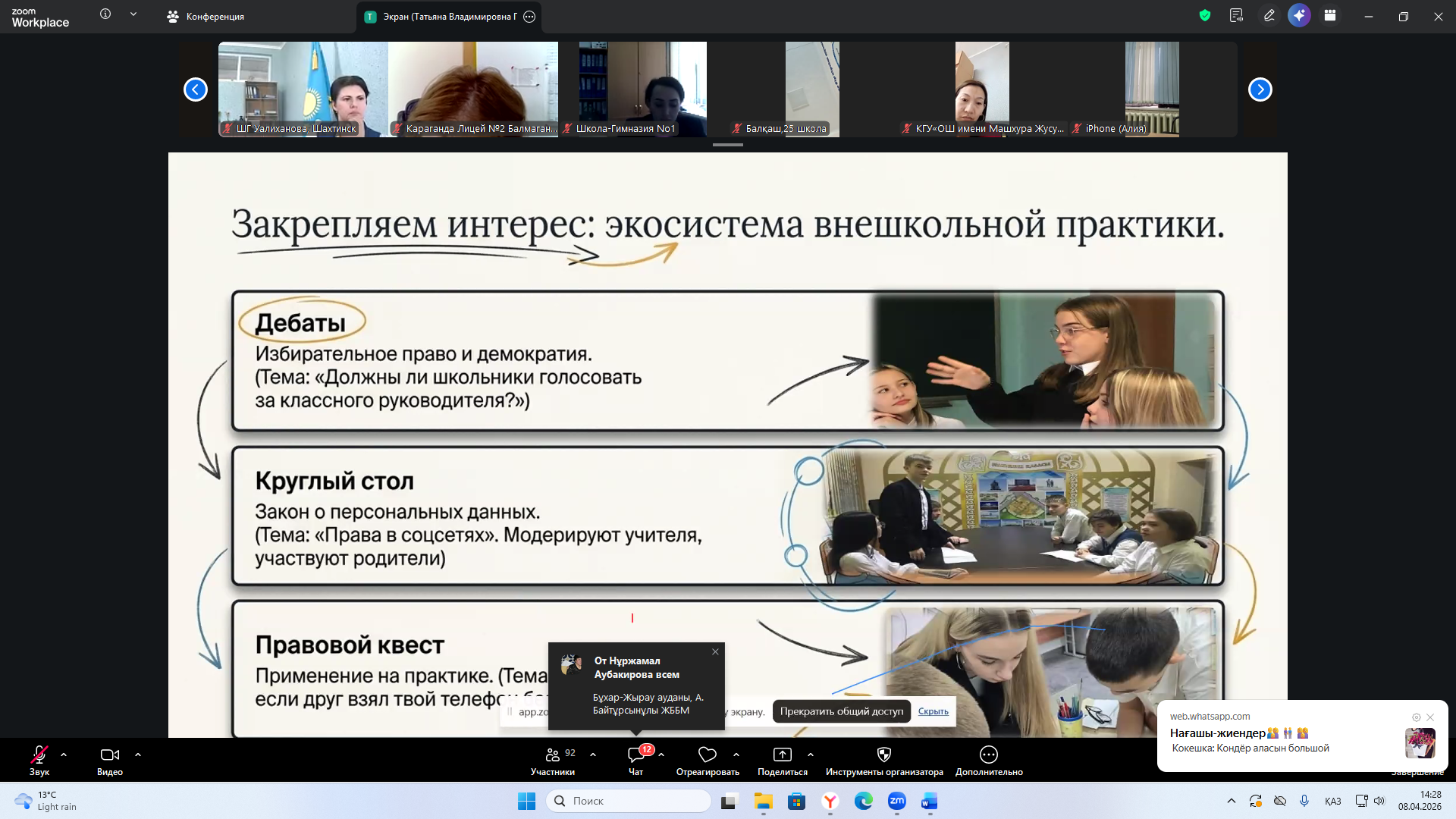 Учебно-методический центр развития образования Карагандинской области 8 апреля 2026 года провел нетворкинг в рамках реализации проекта «Юный юрист» в онлайн режиме на платформе ZOOM на базе КГУ «Школы гимназии имени Ш.Уалиханова» города Шахтинска «Сухие статьи или инструмент для жизни». В ходе нетворкинг-практикума были представлены деловые игры и сценарии мероприятий, которые рассрывают раннюю профориентацию обучающихся в выборе будущей профессии в ходе реализации проекта «Юный юрист». Так же были рассмотрены особенности проведения деловой игры «Сказки как зеркало жизни» в рамках реализации дебатного движения. Нетворкинг- практикум вызвал заслуженный интерес среди коллег и получил позитивные отзывы от коллег.