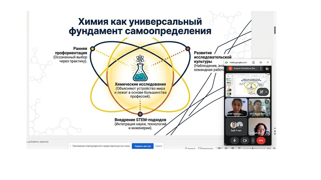 Савенко Анастасия Олеговна (преподаватель химии ГККП «Шахтинский технологический колледж») представила программу «От опыта к результату». Спикер поделилась результатами реализации данной программы, направленной на развитие профориентационного пространства через химические исследования.