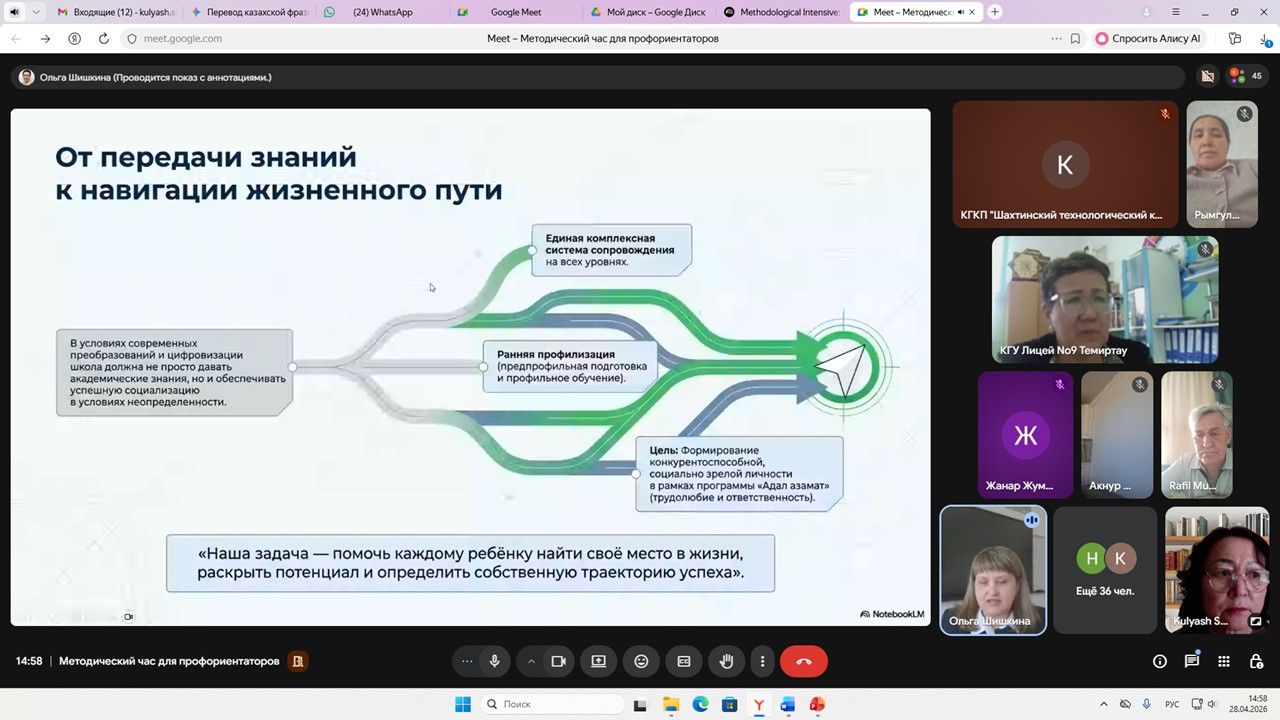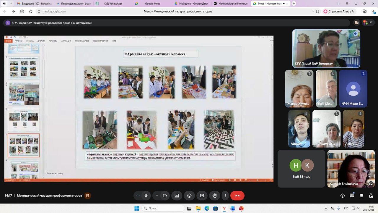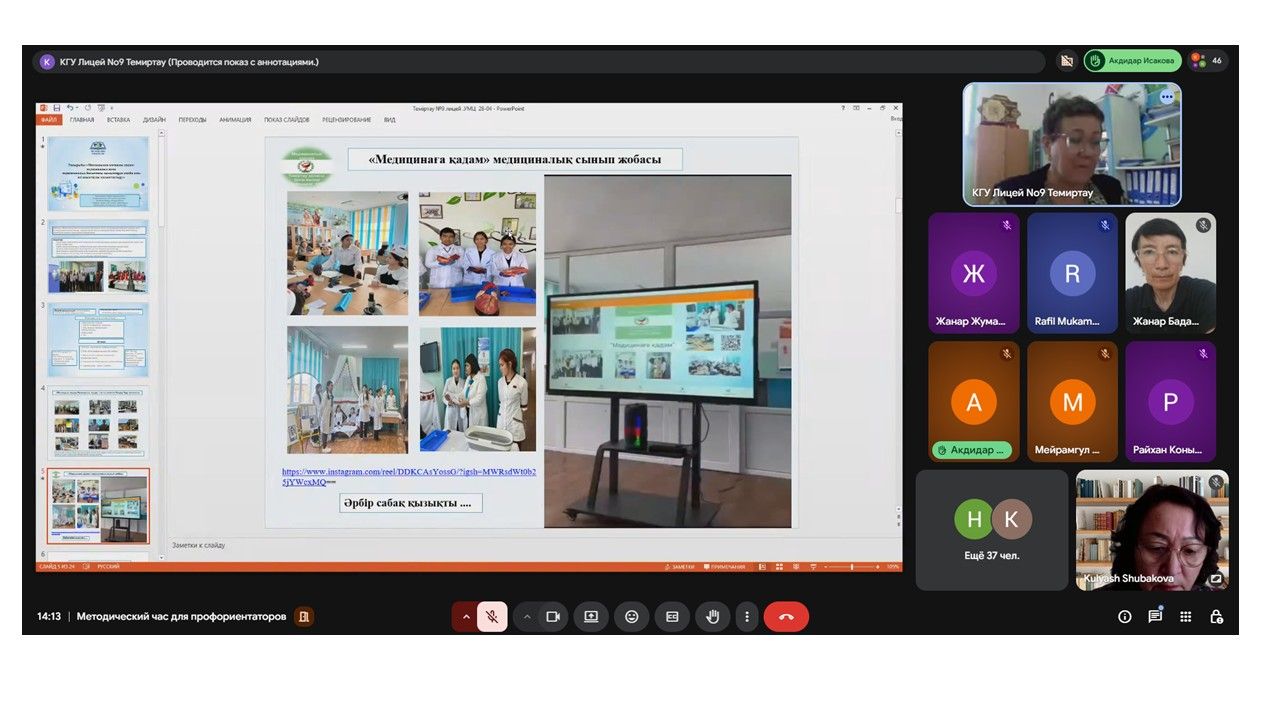 28 апреля 2026 года, согласно плану работы Учебно-методического центра развития образования Карагандинской области, состоялся методический час для педагогов-профориентаторов на тему: «Создание профориентационной среды путем интеграции учебных предметов и внеурочной деятельности».
