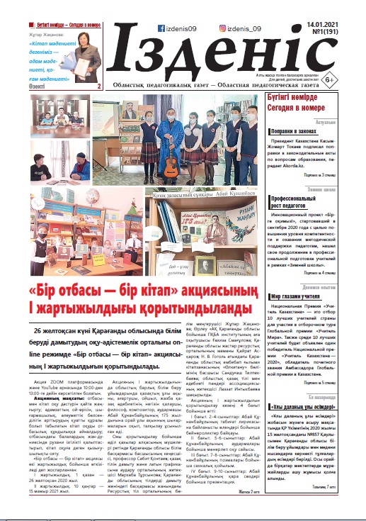 Автор №1-191 от 14.01.2021 Мақала атауы 1 Алғашқы бет 1 ҚО ББД ОӘО «Бір отбасы-бір кітап» акциясының І жартыжылдығы қорытындыланды 2 Өзекті 2 ҚО ББД ОӘО «Бір отбасы-бір кітап» акциясының І жартыжылдығы қорытындыланды 3 Ж.ЖАҚАНОВА, Қарағанды облысының тілдерді дамыту жөніндегі басқармасы жанындағы Ресурстық тіл орталығының бөлім меңгерушісі Жаңғырған дәстүр 4 А.Т.ЖАПБАРҚҰЛОВА қазақ тілі мен әдебиеті пәнінің мұғалімі Әлихан Бөкейхан атындағы №76 ЖББОМ Қарағанды қаласы Күш – білімде, білім - кітапта 3 Актуально 5 МОН РК Дистанционное образование закреплено законом 6 Қарағанды облысы әкімінің баспасөз қызметі Нұра ауданында коворкинг-орталық ашылды 7 №104 мектеп Президенттен сыйлық алды 4 Қысқы мектеп 8 Ж. К. ДЮСЕМБИНА, методист по инновационной деятельности, УМЦ РО КО Профессиональный рост педагогов через участие в мастер-классах в рамках "Зимней школы" 9 Г. О. СУЛЕЙМАНОВА, Әдіскер, ҚО ББД ОӘО «Зейін» жобасы 10 К. Б. АХМАЛТДИНОВА, методист УМЦ РО КО Годичный обучающий курс «Болашақ басшы» 11 Анонс Методические рекомендации по профилактике школьного буллинга среди несовершеннолетних в организациях образования. 5 Делимся опытом 12 А.Ж.ЖЕКЕНОВА, тәрбие ісі жөніндегі орынбасары, «№7 ЖОББМ» КММ Сәтбаев қаласы Қысқы демалыс күндерінің қызықты сәттерінен естелік 13 Нина Крамер Мир глазами учителя 6 Ел назарында 14 Құттықтаймыз! Білім және ғылым министрі А.Аймағамбетов Қарағанды облысы білім басқармасының басшысы Гүлсім Қожахметоваға "Білім беру ісінің құрметті қызметкері" төсбелгісін табыстады 15 А. Д. БУГУБАЕВА, методист по дошкольному воспитанию и обучению УМЦ РО КО Курсы руководителей дошкольных организаций образования 7 В центре внимания 16 Ботагоз ШАМАРОВА, «Ізденіс» Қарағанды облысында мектеп жанындағы мұражайлар ашылуда 17 Аңдатпа «Ізденіс» газетінде «Құттықтаймыз» айдары тұрақты түрде жұмыс жасайды. 8 Алтын ұя 18 М.Т.МАКАЖАНОВА, қазақ тілі мен әдебиеті пәнінің мұғалімі, академик Е.А.Бөкетовь атындағы № 52 жалпы білім беретін орта мектебі, Қарағанды қаласы Жұмақ мекен – Жерұйық 19 К.Б.ЖАРКЕЕВА, Әлеуметтік педагог, «№92 гимназия» КММ, Қарағанды қаласы Әлеуметтік педагог қызметінің жұмыс жүйесі 20 Э.Н.ТУЛЕНДИНА, География пәнінің мұғалімі, ЖББ типтік мектеп интернат, Балқаш қаласы Өз өлкеңді танып және сүйе біл 9 Учительская 21 И. В. БОНДАРЬ, заместитель директора, КГУ ОСШ№3, г.Балхаш Как функционирует балхашский «Совет отцов» 22 А. И. ФРАНЦЕН, учитель-логопед, КГУ «Детский дом для детей с ограниченными возможностями в развитии» Мечты сбываются! 10 Әдістемелік қоржын 23 Ж.А.ИДРИСОВА, қазақ тілі мен әдебиет пәні мұғалімі, ЖББ № 77 МБК, Қарағанды қаласы Жаңартылған білім -жаңаша көзқарас 24 А. А. АНАФИНА, Н. И. ИВАНЕНКО, заместители директора, КГУ «Ельтайская ОСШ» Бухар-Жырауского района. Как повысить качество знаний: из опыта работы КГУ «Ельтайская ОСШ» 11 Әдістемелік қоржын 25 М.Ж.ТУРЕБЕКОВ Мектеп директоры, "Жезқазған қаласының білім бөлімінің №9 тірек мектеп-интернаты (ресурстық орталық)"КММ Ресурстық орталық оқушыларына кәсіби білім беру арқылы бәсекеге қабілетті тұлға қалыптастыру 26 Қатар жүрген қимас дос... 27 П.Д.ТӨКЕН, қазақ тілі мен әдебиеті мұғалімі, 95 мектеп гимназия, Қарағанды қаласы Өнер, білім - бәрі де оқуменен табылған 12 Зерде 28 «Рухани жаңғыру» бағдарламасын іске асыру жөніндегі 2020 жылға арналған іс-шаралар жоспары бойынша әдістемелік нұсқаул