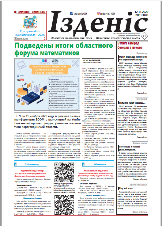 Автор №21-187 от 12.11.2020 Мақала атауы 1 Алғашқы бет 1 О. Ю. КАЛИНИНА, методист УМЦ РО КО Подведены итоги областного форума математиков 2 Объявление Продолжается подписка на областную педагогическую газету «Ізденіс» на 2021 год. 2 Жаңалықтар 3 УМЦ РО КО Как проходит Осенняя школа-2020 4 Г.М.ДУКЕНБАЕВА, әдістемелік кабинет меңгерушісі, Ұлытау ауданы Ұлытау ауданында балалар өнер мектебі және оқушылар үйі ашылды 5 А.А.АШИРБЕКОВА, директордың тәрбие ісі жөніндегі орынбасары, «№6 Жезді ЖОББМБТМ (РО)» КММ Жаңа футбол алаңындағы достық кездесу 3 Өнегелі өмір 6 № 26 гимназиясы Жезқазған қаласы Жаңа жоба жастарға жол ашады 7 А.ТҰРСЫНБАЙ, М.Жұмабаев атындағы №39 гимназиясы, Қарағанды қаласы Ғылымға көңіл берсеңіз 8 Д.АБЕЛЬДИНОВА, директордың тәрбие ісі жөніндегі орынбасары, «С.Сейфуллин атындағы гимназия» КММ, Сәтбаев қаласы Ұлытаудың ұланы 4 Актуально 9 Нина Крамер Культурное сердце школы 10 Анонс Региональный дистанционный конкурс «Шабыт шаттығы» 5 Гость номера 11 Аида Рахимкулова Дебат үйірмесін жүргізетін мамандарға арналған вебинар 12 УМЦ РО КО «ЗЕЙІН» ЖОБАСЫ 6 Делимся опытом 13 К. Б. АХМАЛТДИНОВА, методист УМЦ РО Как готовят кадровый резерв руководителей организаций образования Карагандинской области 14 С. К. ТУЛЕПБЕКОВА, методист УМЦ РО КО Курсы «Светскость и основы религиоведения» 15 Анонс Областной дистанционный педагогический конкурс «Лучший педагогический проект» 7 В центре внимания 16 Отдел ДОиРОВИ Кто стал лучшим логопедом 2020 года? 17 Подведены итоги конкурса «Лучший психолог -2020» 8 Алтын ұя 18 Ақниет Маратқызы, «ЖББ №61 орта мектеп» КММ, бастауыш сынып мұғалімі, Қарағанды қаласы Бастауыш сынып оқушыларының мектепке бейімделуі 19 Г.З.НЫҒЫЗБАЕВА, Қазақ тілі мұғалімі, «Думан» бөбекжайы КМҚК, Қарағанды қаласы Мектепке дейінгі мекемеде мемлекеттік тілді кеңінен насихаттау жолдары 9 Учительская 20 З. А. КЕРИМОВА, школа-гимназия №1, г.Шахтинск Teaching in the pandemic era: problems and potential solutions 21 А. БАЙМЕТОВА, педагог-психолог, МЦ КГУ «Дубовская ОШ», Абайский район С благодарностью Учителям 10 Әдістемелік қоржын 22 Ю. А. ОХРИМЕНКО, учитель английского языка, ОСШ №24, г. Темиртау Play and learn: изучаем английский с помощью игр 23 Ж. С. МУХАМЕДЖАНОВА, заведующая библиотекой, №101 школа-лицей Библиотека нового формата: больше возможностей для работы с информацией 11 Техническое и профессиональное образование 24 А.К.НАСЫРОВА «Bolashaq» жоғарғы колледжінің тарих пәнінің оқытушысы Облыстық онлайн олимпиада өтті 25 Е. А. АББАЗОВА, преподаватель английского языка, Саранский высший гуманитарно-технический колледж имени Абая Кунанбаева Как рационально использовать возможности? «BBB – Best Brains Battle» в рамках дистанционного обучения 26 Қ.А.ҚАХАРМАН, директордың оқу-тәрбие ісі жөніндегі орынбасары, «Қарсақпай агротехникалық колледжі» КММ Ізденімпаз ұстаз-заман талабы 12 Зерде 27 Г. С. КОПБАЕВА, заместитель директора УМЦ РО КО Подведены итоги пилотного проекта «Моя Экошкола Жизни» 28 Ботагоз ШАМАРОВА, «Ізденіс» Педагоги обсудили создание модели экологического образования в колледжах