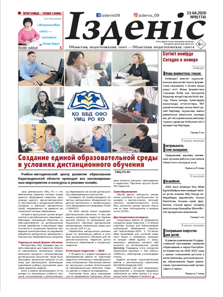 Автор №8-174 23.04.2020 Мақала атауы 1 Алғашқы бет УМЦ РО КО Создание единой образовательной среды в условиях дистанционного обучения 2 Jańalyqtar ҚР БҒМ баспасөз қызметі Жаңа форматтағы тоқсан Нина КРАМЕР Как в условиях карантинных ограничений проходит дополнительное образование? 3 Наши проекты Г. С. КОПБАЕВА Определили победителей областного конкурса «ТÁRBIE.kz» Г. З. АБИШЕВА Подведены итоги областного дистанционного конкурса «Мастерская учителя-дефектолога» Объявление Областной дистанционный конкурс «Творческий библиотекарь — 2020» 4 Resmi «Келешек-2030» баспасы Бастауыш сыныптарға арналған оқу құралдары А. С. БАЙМОЛДИНА Қашықтан оқыту технологиясының тиімділігі 5 Bizdiń suhbat Айнұр ЕГІНБАЙ Гуля Касимова: «Жаңашылдық үлгісі — қосымша білім беру» 6 El nazarynda Облыстық эссе байқауының қорытындысы Итоги областного дистанционного конкурса эссе среди учителей русского и английского языков Анаркүл БҰХАРОВА Абай сөзі — рухани азық, жөн сілтер темірқазық Д. Е. АЛЬКУЛОВА А. Г. ЕРНАЗАРОВА Актуальность слов назидания Абая 7 В центре внимания УМЦ РО КО Мир театрального искусства для детей Айнұр ЕГІНБАЙ Фирмалық стильді дұрыс қолданып жүрсіз бе? 8 Qashyqtyqtan oqytý Г. Г. АДАМБЕКОВА Н. М. ГАРИПОВА Мектепалды дайындық сыныптарында қашықтан оқыту Э. А. ДЖУНУСБЕКОВА Оқушылардың танымдық ойлау қабілеті 9 Altyn uıa ЖББ № 16 лингвистикалық орта мектебі ұжымы Еңбекшіл ұстаз — ел құрметтісі Қарағанды қаласының білім бөлімі «Бір кітап — бір отбасы» қалалық акциясы Б. Қ. ҚАДЫЛ, Б. Қ. ЖУНУСОВА Абай шығармаларын оқытуда қалыптастырушы бағалау тапсырмалары 10 Инклюзивное образование Ж. А. ЕРЖОЛОВА А. Н. САКАЕВА Новые ориентиры деятельности психолого-медико-педагогической консультации Т. В. КУДРЯВЦЕВА О. А. ЕФИМОВА Инклюзивное волонтерство 11 Ádistemelik qorjyn А. Ә. БОТАБЕК Ұлы даланың ұлы ұстазы А. И. СЫЗДЫКОВА STEAM-білім беру — заманауи білім беру феномені 12 Zerde Құттықтаймыз! Сарсенбекова Ардақ Құдайбергенқызы Бейсембаева Мариаш Абдрамановна Ботагоз ШАМАРОВА Экологическое воспитание без перерывов