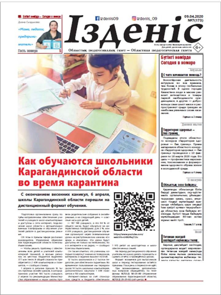 Автор №7-173 09.10.2020 Мақала атауы 1 Алғашқы бет Как обучаются школьники Карагандинской области во время карантина 2 Úndeý Елбасы Нұрсұлтан Назарбаев Қазақстан халқына үндеу жолдады Күліш ТӨЛЕУХАНҚЫЗЫ Елді бірлікке бастаған үндеу Сенім телефоны 3 Ózekti Айнұр ЕГІНБАЙ Қашықтан оқыту мен онлайн оқытудың айырмашылығы Нина КРАМЕР С чего начинается помощь? Как в отечественных школах прививают принципы социальной отвественности 4 Делимся опытом Г. С. КОПБАЕВА Подведены итоги областного конкурса «Территория здоровья — без границ» Нина КРАМЕР Идея с богатой историей Чем объяснялась необходимость удаленного образования года, десятилетия и века назад? 5 Гость номера Диана СЫЗДЫКОВА Мама, педагог, предприниматель 6 El nazarynda «Абайдың қара сөздері һәм қазіргі қоғам» облыстық эссе байқауы Бұқар АМАНГЕЛДІ «Жан құмары дүниеде немене екен…» Айнур НУРПЕИСОВА Абай ұлағаты мәңгілік Дидар ТОРЕКЕЛДИНА Абай дана қазақта 7 В центре внимания И. А. АЛЕНТАЕВА Актуальность «Слов назидания» Абая Р. О. БЕКМАГАМБЕТОВА Пойми меня сердцем своим Хабарландыру «Абай мұрасы — халық қазынасы» атты Абай қара сөздерін мәнерлеп оқу байқауы 8 Altyn uıa С. Т. БАЙЖҰМАНОВА Ағаштан ою ойған шебер А. М. АКМАГАМБЕТОВА Тиімді әдіс-тәсіл — сапалы оқытудың ұтымды жолы А. К. ИСАИНОВА Ұлы тұлғаларды ұлықтау М. Т. КАППАРОВА Ғылыми жоба жеңімпазы 9 Дистанционное образование Л. А. ТЕМЕРХАНОВА Четвертая четверть онлайн Школьники перешли на новый формат обучения М. С. ЖУМАДИЛЬДИН Дистанционное обучение в колледжах: в удобное время в любом месте 10 Методическая копилка Ж. Ж. ТОХМЕТОВА Буктрейлер как средство обучения 11 Resmi Төтенше жағдай кезінде білім беру ұйымдарының қызметкерлеріне еңбекақы төлеу туралы Об оплате труда работников образования в условиях чрезвычайного положения 12 Zerde Поздравляем! Макарова Наталия Дмитриевна и Ляпунова Елена Николаевна Г. С. КОПБАЕВА А. В. БЕРМИЧЕВА Стажерская площадка — трансляция педагогического опыта