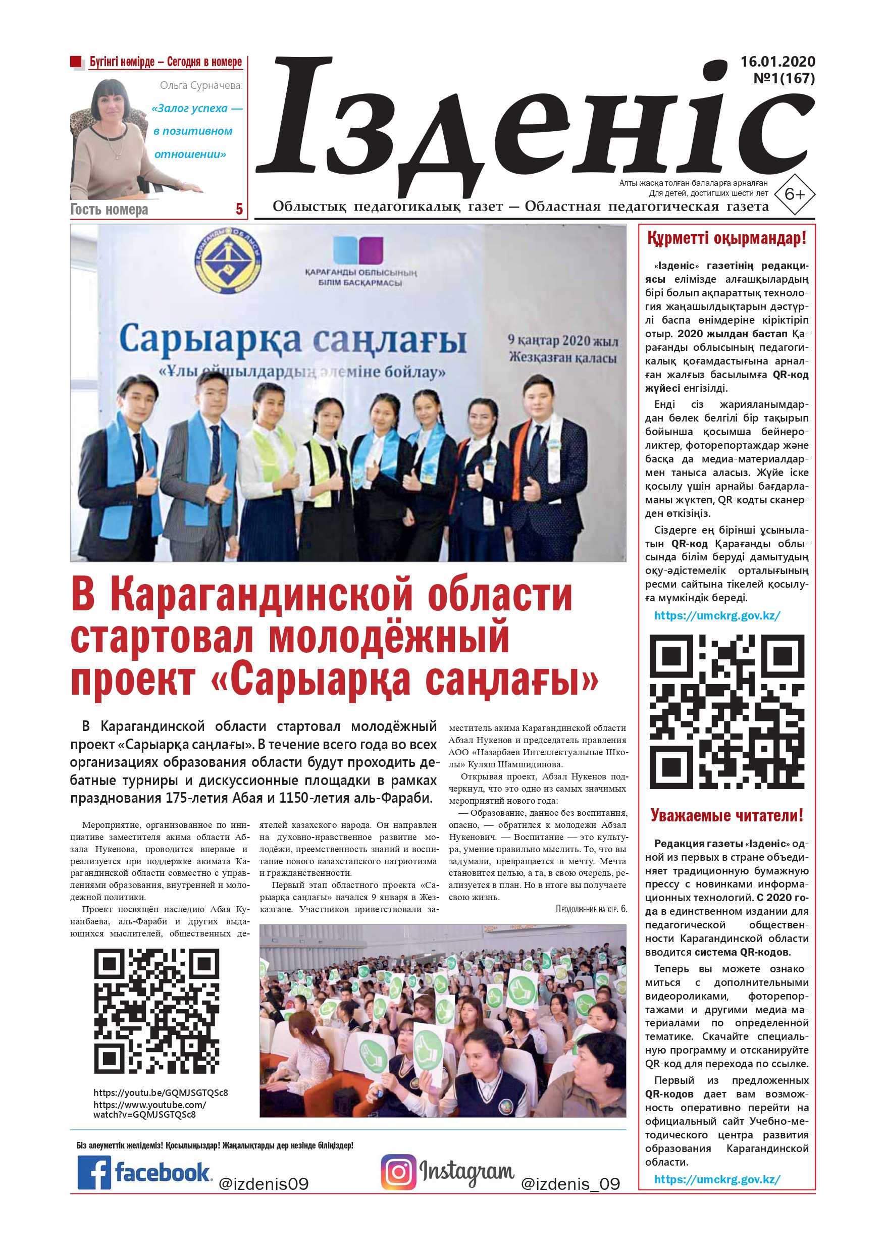 Автор №2-168 30.01.2020 Мақала атауы 1 Алғашқы бет В Карагандинской области стартовал пилотный проект «Сельская школа» 2 Jańalyqtar Қазақстан Республикасының білім беруді және ғылымды дамытудың 2020-2025 жылдарға арналған мемлекеттік бағдарламасы туралы 3 Актуально Мемлекеттік тұлға Жаңа кітап жарық көрді Айнұр ЕГІНБАЙ Атаулы әлеуметтік көмек Қаржыландыру мектептер арасында пропорционалды түрде бөлінеді А. А. ҚАЛИ Виртуальное путешествие по Карагандинской области 4 Делимся опытом Ж. А. АЙТЖАНОВА В Балхаше прошел областной семинар для учителей физкультуры А. В. БЕРМИЧЕВА Педагоги обсудили состояние и перспективы дополнительного образования 5 RoboLand 2020 Нина КРАМЕР Борьба за цифровое совершенство Как идет подготовка к одному из самых главных событий года в образовании? 6 В центре внимания Экошкола Жизни продолжает свой маршрут Ботагоз ШАМАРОВА Эковоспитание начинается с семьи: как мама может повлиять на успех ребенка 7 El nazarynda «Birgemiz» Волонтер жылын өткізу тұжырымдамасы Концепция к проведению Года волонтера «Birgemiz» 8 Altyn uıa Б. С. НАЗАРОВА Құндылықтар жүйесі «Білім-инновация» лицейлерінің іс-тәжірибесін тарату С. М. СЕРИКОВА Балабақша — тәрбиенің алтын бесігі А. А. ҚЫЗЫЛОВ Дәстүрге айналған шара 9 Ádistemeliq qorjyn Айнұр ЕГІНБАЙ Бағалау жүйесі Күнделіктегі баға емес, балаға не қажет сол маңызды 10 Техническое и профессиональное образование Н. А. САЛИНА, Е. С. КУЗЬМИЧ Моя профессия — химик И. Б. КИСЕЛЕВА Какова роль попечительского совета в развитии колледжа 11 Техническое и профессиональное образование А. Т. АЛЬХАНОВА Н. Н. ОСЬКИНА От истории до династии железнодорожников А. С. АЛЬКЕЕВА Латын әліпбиі Мәңгілік елдің рухани жаңғыруы 12 Зерде Ақтоғай ауданының педагогтер қауымы Құттықтаймыз! Жүнісов Сейіл Мінтайұлы! А. К. ОСПАНОВА Путешествие в мир зелёной экономики М. А. ТКАЧЕВА Б. М. ХАМИТОВА Экологическое воспитание в инновационном режиме Поздравляем! Активисты экодвижения