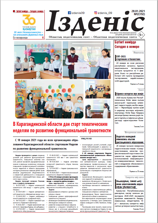 Автор №2-192 от 28.01.2021 Мақала атауы 1 Алғашқы бет УМЦ РО КО В Карагандинской области дан старт тематическим неделям по развитию функциональной грамотности 2 Недели функциональной грамотности Е. А. ТУСУПХАНОВ, «Ж. Ақылбаев атындағы эксперименталдық мектеп-гимназия», Шет ауданы Оқу сауаттылығы апталығы не берді? А. Т. ЖАПБАРҚҰЛОВА, қазақ тілі мен әдебиеті пәнінің мұғалімі, Әлихан Бөкейхан атындағы № 76 ЖББОМ,Қарағанды қаласы «Оқу сауаттылығы» апталығы Б. Е. ЕСИЛЬБЕКОВА, әдіскер, «Айсұлу» бөбекжайы КМҚК, Балқаш қаласы Кітаппен дос болайық бәріміз 3Функционалды сауаттылық апталықтары А. САРКЕНОВА, тарих пәнінің мұғалімі, Көктал ЖОББМ, Жаңаарқа ауданы Ел болашағы — сауатты ұрпақ А. А. ЖАЛЕЛОВ, директор, Мағжан Жұмабаев атындағы № 39 мектеп-гимназия, Қарағанды қаласы Ұрпақ сауаттылығы — елдің келешегі Ш. К. КАПАШЕВА, С. К. РАЗБЕКОВА, қазақ тілі мен әдебиеті пәнінің мұғалімдері, Жамбыл атындағы мамандандырылған мектеп-интернат Танымы мен тағылымы мол іc-шара 4Жаңалықтар Пресс-служба МОН РК ЕНТ-2021 стартовало в Казахстане А. С. БАЛГИНА, әдіскер, «Сарыарқа дарыны» аймақтық ғылыми-практикалық орталығы Арнайы мектеп-интернаттар арасындағы облыстық онлайн олимпиаданың қорытындысы шығарылды Объявление Комитет по охране прав детей МОН РК 5 Өзекті М. А. ЖЕТПИСБАЕВА, «Өрлеу» БАҰО» АҚ Қарағанды филиалы директорының оқу-әдістемелік жұмыстары жөніндегі орынбасары Бірлесе көтерген жүк жеңіл Пікір Бабаханова Гульден Абдрахмановна, бастауыш сынып мұғалімі, «Ж.Ақылбаев атындағы мектеп-гимназиясы» КММ, Шет ауданы: Жаксыбекова Сая Сатбергенова, №15 ЖББОМ директоры, Қарағанды қаласы Саидгараева Г.И., учитель начальных классов, КГУ«ШЦДО им. П. П. Корниенко» 6 Ел назарында Из руководство по использованию фирменного стиля 30 лет Независимости — фирменного стиля как использовать фирменный стиль 7 В центре внимания Соб. инф. Как изменится система технического и высшего образования? Соб. инф. «Мұрагер» мектебінің шәкірті Қазақстанның үздік оқушысы атанды Объявление UMC_OK — мы учим учиться 8 Алтын ұя Г. К. КУМБАЕВА, әлеуметтік педагог, «№ 13 ЖОББМ» КММ, Жезқазған қаласы Әлеуметтік педагогтің инклюзивті білім беру жүйесінде алатын орны Л. А. КАШКЫМБЕКОВА, А. А. КАДИРБЕРЛИНА, мектеп директорының орынбасарлары, «Үштөбе ЖОББТМ (РО)» КММ, Бұқар жырау ауданы Қашықтан оқытудың өзекті мәселелері З. А. МАХТБЕКОВА, қазақ тілі мен әдебиеті пәнінің мұғалімі, «№ 83 Ғ. Мұстафин атындағы ЖББОМ» КММ, Қарағанды қаласы Оқылым дағдысы — мәтінмен жұмыстың негізі 9 Учительская А. К. ИБРАЕВА, координатор ВШ, КГУ «Гимназия № 1 г. Темиртау» Ведущие школы принимают активное участие в областных проектах В. Е. АНИСИМОВА, учитель информатики, КГУ «СОШ № 23», г. Караганда Используем сервис Liveworksheets на уроках информатики 10Методическая копилка А. Т. ТОКЕЙБЕКОВА, директор, ЖББ № 8 орта мектебі, Балқаш қаласы «Рухани жаңғыру» бағдарламасы аясында азаматтық-патриоттық тәрбиені жетілдіру ЧУ «Карагандинский коммерческий колледж» Педагоги колледжей обменялись опытом дистанционного образования Көңіл айту Рахимжанова Әнел Жекішқызы 11 Ресми Облыстық «БІР ОТБАСЫ-БІР КІТАП» акциясы аясындағы «ОҚЫРМАН ОТБАСЫ» байқауының Ережесі 12Салауатты өмір салты Ы. Алтынсарин атындағы ҰБА әдістемелік ұсынымдарынан Нашақорлық, темекі шегу және алкоголизмнің алдын алуды ұйымдастыру Салауатты өмір салтын қалыптаст